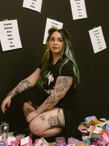 I’m Megan, (she/her), the owner and creative mind behind Fixation Alchemy. I am an extensions specialist, vivid color specialist, and color correction specialist. I’ve been behind the chair for 13 years, and hair is truly my passion. Outside of the salon, you can find me eating great food with my husband of 5 years, cuddled up on my couch with either or both of my two amazing daughters, playing d&d with my friends, but let’s be honest, I’m always at the salon. Animals outnumber humans in my house by almost double. I survive off of coconut or winter redbull and cheese. And my favorite colors are black, green, and pink.